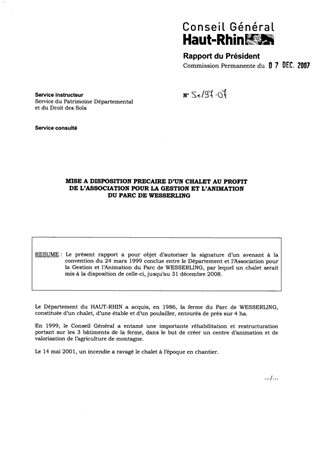 Le présent rapport a pour objet d’autoriser la signature d’un avenant à la convention du 24 mars 1999 conclue entre le Département et l’Association pour la Gestion et l’Animation du Parc de WESSERLING, par lequel un chalet serait mis à la disposition de celle-ci, jusqu’au 31 décembre 2008.