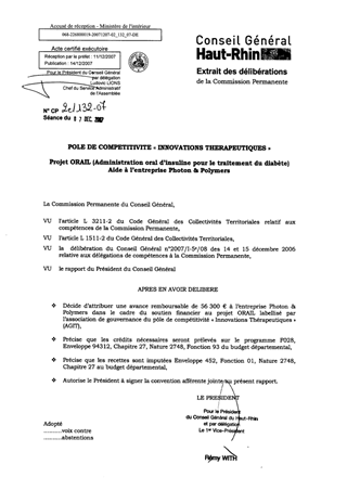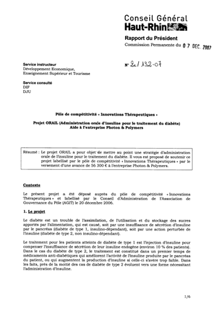 Le projet ORAIL a pour objet de mettre au point une stratégie d’administration orale de l’insuline pour le traitement du diabète. Il vous est proposé de soutenir ce projet labellisé par le pôle de compétitivité « Innovations Thérapeutiques » par le versement d’une avance de 56 300 € à l’entreprise Photon & Polymers.
