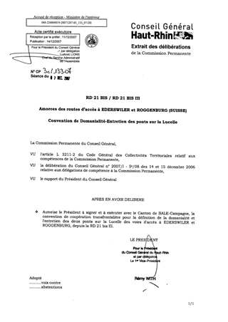 RD 21 Bis / RD 21 BIS III - Amorces des routes d'accès à EDERSWILER et ROGGENBURG (Suisse) - Convention de domanialité-entretien des ponts sur la Lucelle.