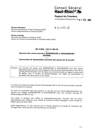 Les amorces de routes entre EDERSWILER et ROGGENBURG sont des routes départementales de très courte longueur entre la Route Internationale et l'axe de la Lucelle formant frontière avec la Suisse. La convention jointe au rapport a pour objet de définir, avec le Canton de BALE-Campagne, les règles de domanialité et d'entretien des deux ponts sur la Lucelle.