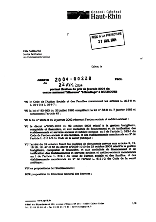 Portant fixation du prix de journée 2004 du Centre maternel "Mineures" "L'Ermitage" à MULHOUSE Resumé Pièces jointes ARRETE Assemblée : Non défini Date : 22/04/2004 Rapporteur : Non défini Collectivité : Conseil départemental du Haut-Rhin Direction : Non défini Service : Service de la Tarification des Etablissements Domaine : Prix de Journée Commission :