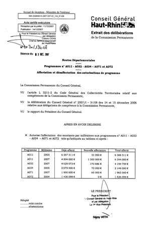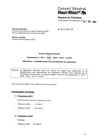 Le Règlement Financier dans son article 6.6 stipule que l’affectation et la désaffectation des Autorisations de Programme relèvent d’une décision de la Commission Permanente. Le présent rapport concerne les programmes n° A011 -A032 - A034 – A071 et A072.