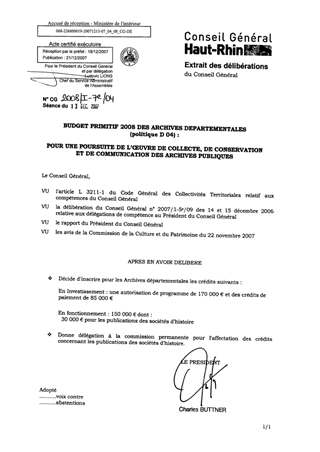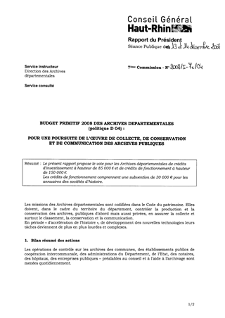 Le Budget Primitif 2008 des Archives départementales : pour une poursuite de l'oeuvre de collecte, de conservation et de communication des archives publiques