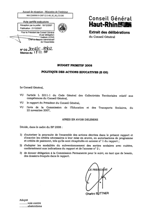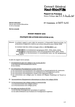 Budget Primitif 2008. Politique des actions éducatives (E 05).