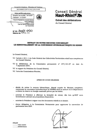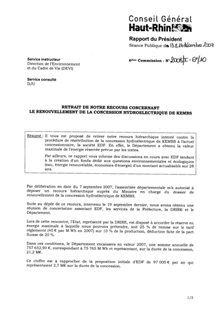 Il vous est proposé de retirer notre recours hiérarchique intenté contre la procédure de réattribution de la concession hydroélectrique de KEMBS à l’actuel concessionnaire, la société EDF. En effet, le Département a obtenu la valeur maximale de l'énergie réservée prévue par les textes. Par ailleurs, ce rapport vous informe des discussions en cours avec EDF tendant à la création d'un fonds dédié aux questions environnementales et écologiques (eau, énergie renouvelable, économies d'énergie) d'un montant actualisable sur 28 ans.