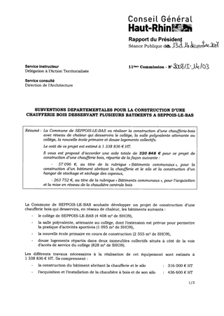 La Commune de SEPPOIS-LE-BAS va réaliser la construction d’une chaufferie-bois avec réseau de chaleur qui desservira le collège, la salle polyvalente attenante au collège, la nouvelle école primaire et douze logements collectifs. Le coût de ce projet est estimé à 1 338 836 € HT. Il vous est proposé d’accorder une aide totale de 320 848 € pour ce projet de construction d’une chaufferie bois, répartie de la façon suivante : - 57 096 €, au titre de la rubrique « Bâtiments communaux », pour la construction d’un bâtiment abritant la chaufferie et le silo et la construction d’un hangar de stockage et séchage des copeaux, - 263 752 €, au titre de la rubrique « Bâtiments communaux », pour l’acquisition et la mise en réseau de la chaudière centrale bois