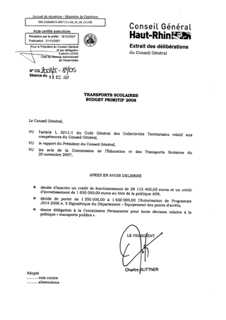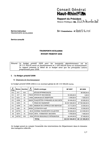Le budget primitif 2008 pour les transports départementaux est de 28 115 400,00 euros en fonctionnement et 1 650 000,00 euros en investissement. Le rapport présente le détail de ce budget ainsi que les principales actions programmées pour 2008.