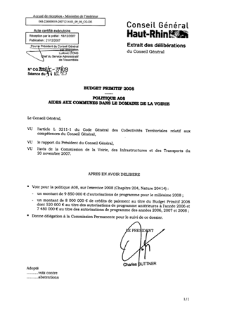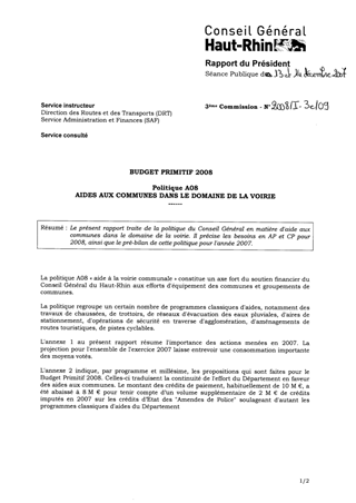 : Le présent rapport traite de la politique du Conseil Général en matière d'aide aux communes dans le domaine de la voirie. Il précise les besoins en AP et CP pour 2008, ainsi que le pré-bilan de cette politique pour l'année 2007.