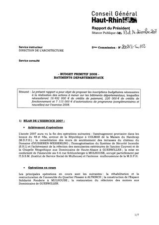 Le présent rapport a pour objet de proposer les inscriptions budgétaires nécessaires à la réalisation des actions à mener sur les bâtiments départementaux, lesquelles nécessiteront 16 492 000 € de crédits de paiement, 220 000 € de crédits de fonctionnement et 7 115 000 € d’autorisations de programme (complémentaires et nouvelles) sur l’exercice 2008.