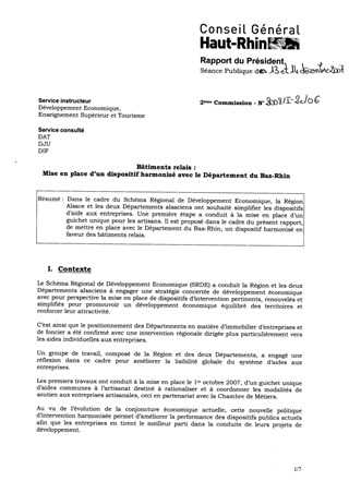 Dans le cadre du Schéma Régional de Développement Economique, la Région Alsace et les deux Départements alsaciens ont souhaité simplifier les dispositifs d’aide aux entreprises. Une première étape a conduit à la mise en place d’un guichet unique pour les artisans. Il est proposé dans le cadre du présent rapport, de mettre en place avec le Département du Bas-Rhin, un dispositif harmonisé en faveur des bâtiments relais.