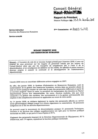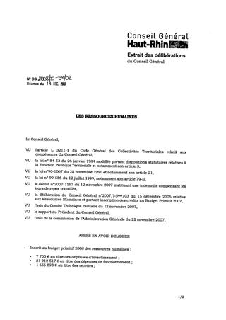 A l’occasion du vote de ce nouveau budget primitif pour l’exercice 2008, il vous est proposé de vous prononcer sur les moyens en personnel induits par les actions du Conseil Général ainsi que par les transferts de compétences liés à l’acte II de la décentralisation, et en conséquence de délibérer sur les crédits, les effectifs et autres mesures diverses propres à assurer la continuité et le développement de l’administration départementale.