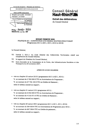 Budget Primitif 2008. Politique A01 - Constitution d'un réseau routier structurant (programmes AA11 à AZ11 - A011, A012 et A013).