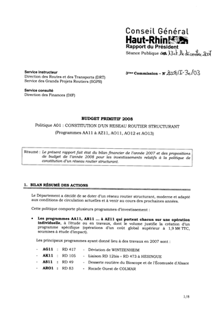 Le présent rapport fait état du bilan financier de l’année 2007 et des propositions de budget de l’année 2008 pour les investissements relatifs à la politique de constitution d’un réseau routier structurant.