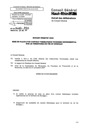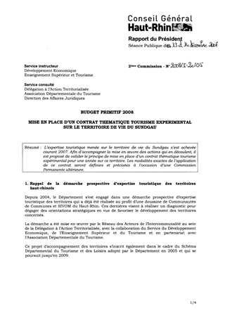 Budget Primitif 2008. Mise en place d'un contrat thématique tourisme expérimental sur le territoire de vie du Sundgau