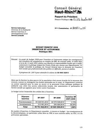 Budget Primitif 2008 - Insertion et autonomie - Politique H01.