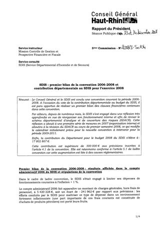 Le Conseil Général et le SDIS ont conclu une convention couvrant la période 2006-2008. A l’occasion du vote de la contribution départementale au budget du SDIS, il est paru opportun de réaliser un premier bilan des clauses financières contenues dans cette convention. Par ailleurs, depuis de nombreux mois, le SDIS s’est engagé dans une réflexion très approfondie en vue de réorganiser son fonctionnement interne et afin de réviser le schéma départemental d’analyse et de couverture des risques (SDACR). Cette réflexion a abouti à une première série de mesures en 2007 (organisation interne) et aboutira à la révision du SDACR au cours de premier semestre 2008, ce qui modifie le calendrier initialement prévu pour la nouvelle convention à intervenir pour la période 2009-2011. Enfin, la contribution du Département pour le budget 2008 du SDIS s’élève à : 17 802 867 €. Cette contribution est supérieure de 300 000 € aux prévisions inscrites à l’article 4.1 de la convention. Elle est néanmoins conforme à l’article 5.1 de ladite convention car cette augmentation est liée à des causes réglementaires.