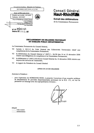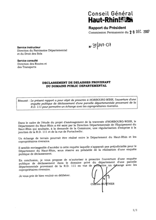 Le présent rapport a pour objet de prescrire à HORBOURG-WIHR, l'ouverture d'une enquête publique de déclassement d'une parcelle départementale provenant de la R.D. 111 pour permettre un échange avec les copropriétaires riverains.