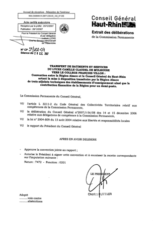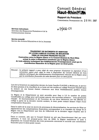 Transfert de bâtiments et services du lycée Camille Claudel de MULHOUSE vers le collège F. VILLON. Convention entre la Région Alsace et le Conseil Général du Haut-Rhin actant la mise à disposition transitoire par la Région Alsace de 3 adjoints techniq