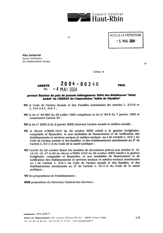 portant fixation du prix de journée hébergement 2004 des Résidences "Saint André" de CERNAY de l'Association "Adèle de Glaubitz" Resumé Pièces jointes ARRETE Assemblée : Non défini Date : 04/05/2004 Rapporteur : Non défini Collectivité : Conseil départemental du Haut-Rhin Direction : Non défini Service : Service de la Tarification des Etablissements Domaine : Prix de Journée Commission :