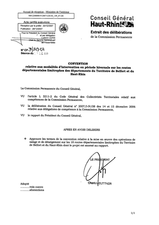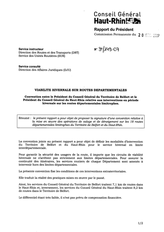 Viabilité hivernale sur routes départementales. Convention entre le Président du Conseil Général du Territoire de BELFORT et le Président du Conseil Général du Haut-Rhin relative aux interventions en période hivernale sur les routes dép. limitrophes.