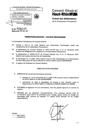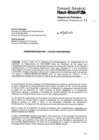 Dans le cadre de la démarche de territorialisation, le renforcement de la présence du Département du HAUT-RHIN dans les Territoires de Vie passe par l’installation des animateurs coordonnateurs dans des locaux afin d’assurer leurs missions (permanences…). Il est proposé d’approuver, d’une part, l’avenant n° 1 à la convention d’occupation de locaux à titre précaire, avec la Ville d’ENSISHEIM pour un loyer annuel de 8 352,96 €, charges comprises, d’autre part, d’approuver la convention pour l’occupation de locaux à SAINTE-MARIE-AUX-MINES pour un loyer annuel de 4 800 €, et des provisions sur charges d’un montant de 600 € par an, et de m’autoriser à les signer.