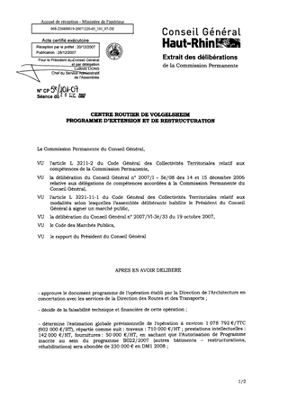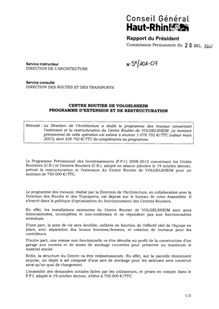 La Direction de l’Architecture a établi le programme des travaux concernant l’extension et la restructuration du Centre Routier de VOLGELSHEIM. Le montant prévisionnel de cette opération est estimé à environ 1 078 792 €/TTC (valeur mars 2007), dont 328 792 €/TTC de compléments au programme.