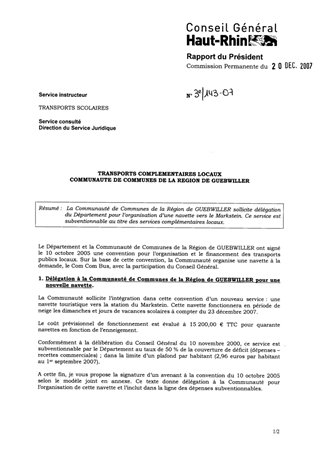La Communauté de Communes de la Région de GUEBWILLER sollicite délégation du Département pour l’organisation d’une navette vers le Markstein. Ce service est subventionnable au titre des services complémentaires locaux.