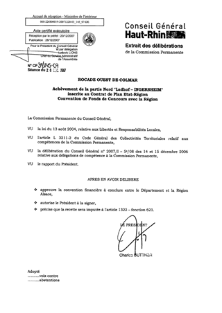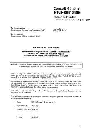 Rocade Ouest de Colmar - Achèvement de la partie Nord "Ladhof - INGERSHEIM" inscrite au Contrat de Plan Etat-Région - Convention de Fonds de Concours avec la Région.