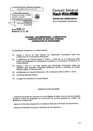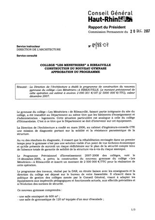 La Direction de l’Architecture a établi le programme de construction du nouveau gymnase du collège « Les Ménétriers » à RIBEAUVILLE. Le montant prévisionnel de cette opération est estimé à environ 2 090 301 €/HT (2 5000 000 €/TTC), valeur décembre 2007.