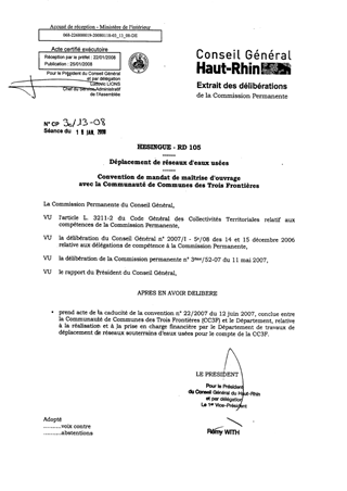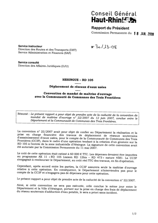 HESINGUE RD 105 - Déplacement de réseaux d'eaux usées. Convention de mandat de maîtrise d'ouvrage avec la Communauté de Communes des Trois Frontières.