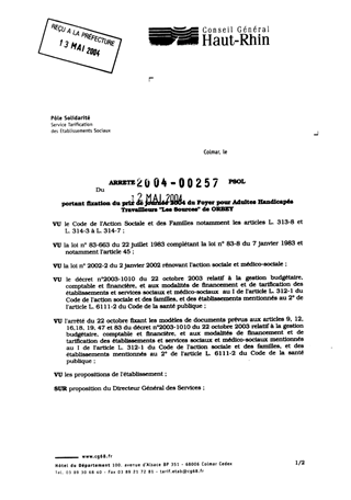 Portant fixation du prix de journée 2004 du Foyer pour Adultes Handicapés Travailleurs "Les sources" de ORBEY Resumé Pièces jointes ARRETE Assemblée : Non défini Date : 12/05/2004 Rapporteur : Non défini Collectivité : Conseil départemental du Haut-Rhin Direction : Non défini Service : Service de la Tarification des Etablissements Domaine : Prix de Journée Commission :