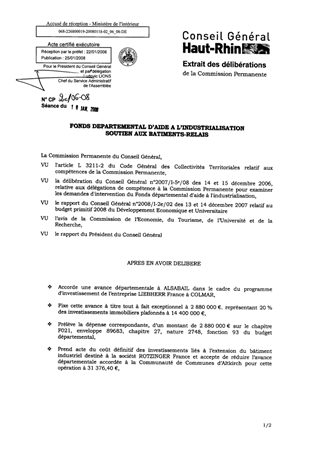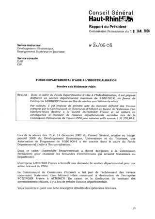 Dans le cadre du Fonds Départemental d’Aide à l’Industrialisation, il est proposé d’affecter un soutien départemental maximum de 2 880 000 € en faveur de l’entreprise LIEBHERR France au titre du soutien aux bâtiments relais. Par ailleurs, il est proposé de prendre acte du montant définitif des travaux entrepris par la Communauté de Communes d’Altkirch en faveur de l’extension d’un bâtiment relais destiné à la société ROTZINGER France et de réduire en conséquence le montant de l’avance départementale accordée lors de la Commission Permanente du 3 mars 2006 pour ramener cette avance à 31 376,40 €.