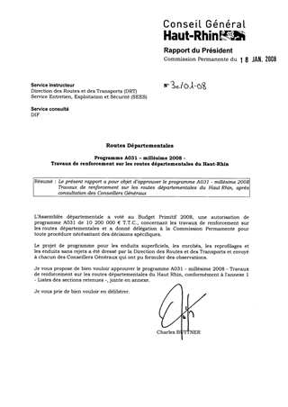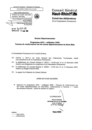 Le présent rapport a pour objet d’approuver le programme A031 - millésime 2008 Travaux de renforcement sur les routes départementales du Haut Rhin, après consultation des Conseillers Généraux