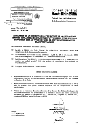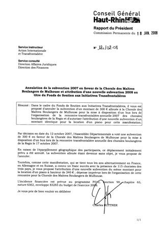 Annulation de la subvention 2007 en faveur de la Chorale des Maîtres Boulangers de MULHOUSE et attribution d'une nouvelle subvention 2008 au titre du Fonds de Soutien aux Initiatives Transfrontalières.