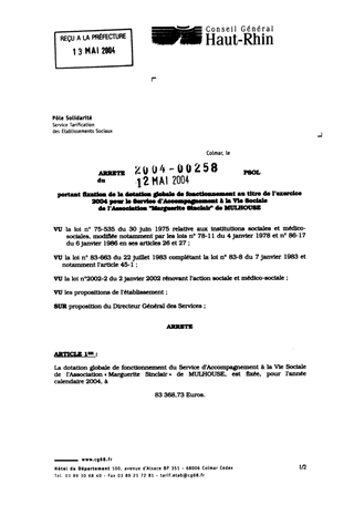 Portant fixation de la dotation globale de fonctionnement au titre e l'exercice 2004 pour le Service d'Accompagnement à la Vie Sociale de l'Association " Marguerite Sinclair" de MULHOUSE Resumé Pièces jointes ARRETE Assemblée : Non défini Date : 12/05/2004 Rapporteur : Non défini Collectivité : Conseil départemental du Haut-Rhin Direction : Non défini Service : Service de la Tarification des Etablissements Domaine : Dotations financières Commission :