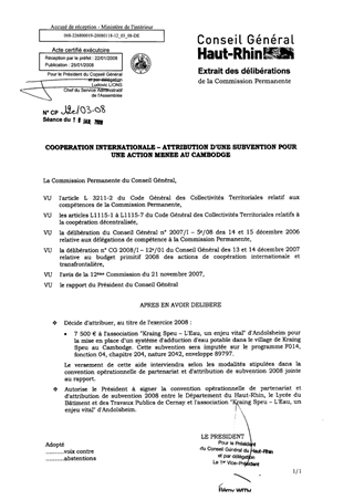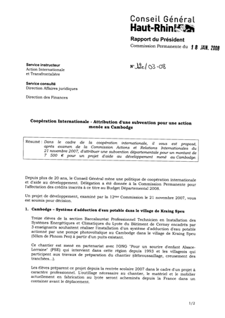 Dans le cadre de la coopération internationale, il vous est proposé, après examen de la Commission Actions et Relations Internationales du 21 novembre 2007, d'attribuer une subvention départementale pour un montant de 7 500 € pour un projet d'aide au développement mené au Cambodge.