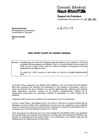 Parallèlement au Grand Prix Départemental des Métiers d’Art institué en 1978 par la Société d’Encouragement aux Métiers d’Art, le Conseil Général a mis en place en 1994, un prix « Jeune Talent » doté de 1 000 € et destiné à récompenser un jeune professionnel des Métiers d’Art. Un crédit de 1 000 € réservé à cette action est inscrit au budget départemental 2008.