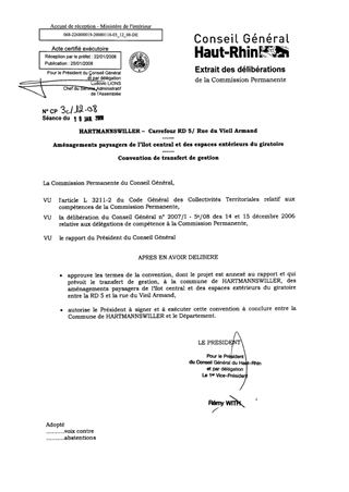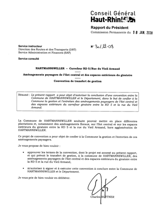 Le présent rapport a pour objet d’autoriser la conclusion d’une convention entre la Commune de HARTMANNSWILLER et le Département, dans le but de confier à la Commune la gestion et l’entretien des aménagements paysagers de l’îlot central et des espaces extérieurs du carrefour giratoire entre la RD 5 et la rue du Vieil Armand.