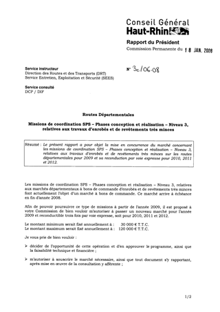 Le présent rapport a pour objet la mise en concurrence du marché concernant les missions de coordination SPS – Phases conception et réalisation – Niveau 3, relatives aux travaux d’enrobés et de revêtements très minces sur les routes départementales pour 2009 et sa reconduction par voie expresse pour 2010, 2011 et 2012.