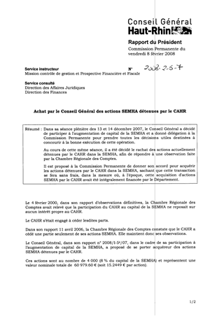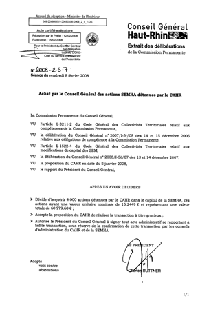 Dans sa séance plénière des 13 et 14 décembre 2007, le Conseil Général a décidé de participer à l'augmentation de capital de la SEMHA et a donné délégation à la Commission Permanente pour prendre toutes les décisions utiles destinées à concourir à la bonne exécution de cette opération. Au cours de cette même séance, il a été décidé le rachat des actions actuellement détenues par le CAHR dans la SEMHA, afin de répondre à une observation faite par la Chambre Régionale des Comptes. Il est proposé à la Commission Permanente de donner son accord pour acquérir les actions détenues par le CAHR dans la SEMHA, sachant que cette transaction se fera sans frais, dans la mesure où, à l'époque, cette acquisition d'actions SEMHA par le CAHR avait été intégralement financée par le Département.