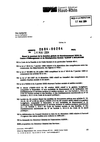 fixant le montant de la dotation globale de fonctionnement 2004 du Centre d'Hébergement et de Réadaptation Sociale "ALEOS" à MULHOUSE Resumé Pièces jointes ARRETE Assemblée : Non défini Date : 14/05/2004 Rapporteur : Non défini Collectivité : Conseil départemental du Haut-Rhin Direction : Non défini Service : Service de la Tarification des Etablissements Domaine : Dotations financières Commission :