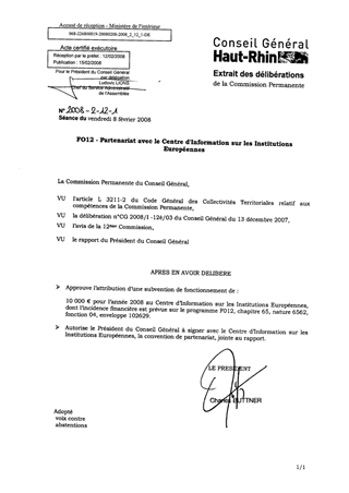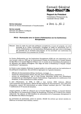 Dans le cadre du suivi des politiques européennes, il vous est proposé, sur avis favorable de la 12ème Commission, d'engager en 2008 un partenariat avec le Centre d'Information sur les Institutions Européennes afin que celui-ci développe ses activités sur le territoire haut-rhinois, en lui accordant une subvention de fonctionnement d'un montant de 10 000€.