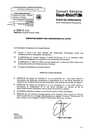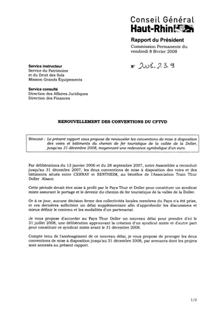 Le présent rapport vous propose de renouveler les conventions de mise à disposition des voies et bâtiments du chemin de fer touristique de la vallée de la Doller, jusqu'au 31 décembre 2008, moyennant une redevance symbolique d'un euro.