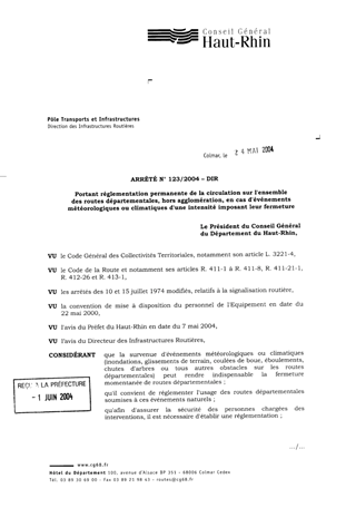 Portant réglementation permanente de la circulation sur l'ensemble des routes départementales, hors agglomération, en cas d'événements météorologiques ou climatiques d'une intensité imposant leur fermeture Resumé Pièces jointes ARRETE Assemblée : Non défini Date : 24/05/2004 Rapporteur : Non défini Collectivité : Conseil départemental du Haut-Rhin Direction : Non défini Service : Direction des Routes Domaine : Circulation Commission :