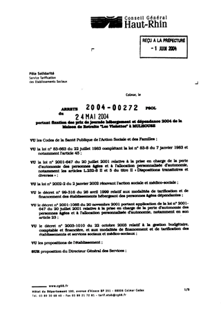 Portant fixation des prix de journée hébergement et dépendance 2004 de la Maison de Retraite "Les Violettes" à MULHOUSE Resumé Pièces jointes ARRETE Assemblée : Non défini Date : 24/05/2004 Rapporteur : Non défini Collectivité : Conseil départemental du Haut-Rhin Direction : Non défini Service : Service de la Tarification des Etablissements Domaine : Prix de Journée Commission :