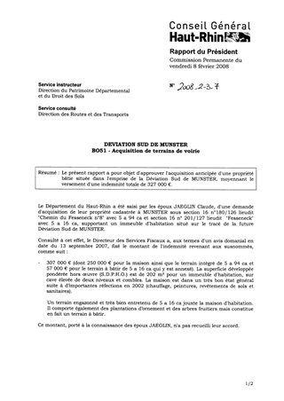 Le présent rapport a pour objet d'approuver l'acquisition anticipée d'une propriété bâtie située dans l'emprise de la Déviation Sud de MUNSTER, moyennant le versement d'une indemnité totale de 327 000 €.