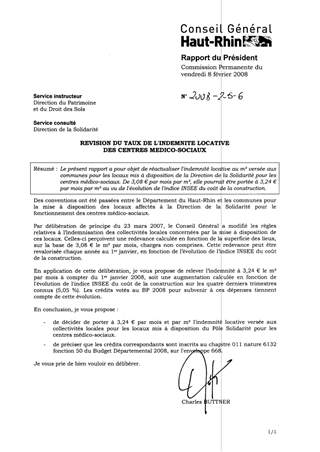 Le présent rapport a pour objet de réactualiser l'indemnité locative au m² versée aux communes pour les locaux mis à disposition de la Direction de la Solidarité pour les centres médico-sociaux. De 3,08 € par mois par m², elle pourrait être portée à 3,24 € par mois par m² au vu de l'évolution de l'indice INSEE du coût de la construction