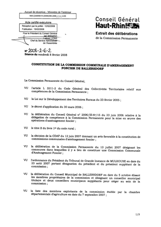 Lors de sa séance du 12 juin 2007, la Commission Départementale d'Aménagement Foncier (CDAF) a donné un avis favorable à la constitution de commissions communales d'aménagement foncier (CCAF) dans les communes de BALLERSDORF, DANNEMARIE, RETZWILLER, ROUFFACH et NIEDERENTZEN. Au titre de l'article R. 123-31 du Code Rural, il appartient au Conseil Général de les constituer.