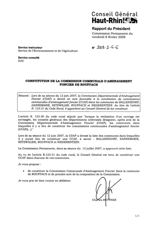Lors de sa séance du 12 juin 2007, la Commission Départementale d'Aménagement Foncier (CDAF) a donné un avis favorable à la constitution de commissions communales d'aménagement foncier (CCAF) dans les communes de BALLERSDORF, DANNEMARIE, RETZWILLER, ROUFFACH et NIEDERENTZEN. Au titre de l'article R. 123-31 du Code Rural, il appartient au Conseil Général de les constituer.
