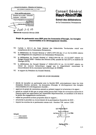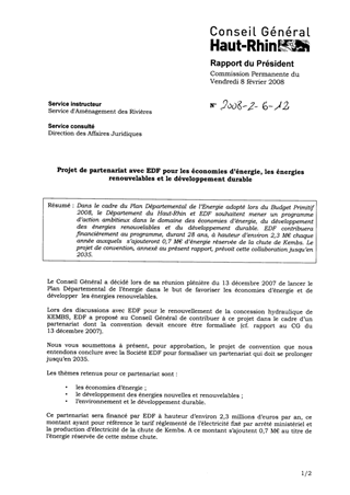 Dans le cadre du Plan Départemental de l’Energie adopté lors du Budget Primitif 2008, le Département du Haut-Rhin et EDF souhaitent mener un programme d’action ambitieux dans le domaine des économies d’énergie, du développement des énergies renouvelables et du développement durable. EDF contribuera financièrement au programme, durant 28 ans, à hauteur d’environ 2,3 M€ chaque année auxquels s’ajouteront 0,7 M€ d’énergie réservée de la chute de Kembs. Le projet de convention, annexé au présent rapport, prévoit cette collaboration jusqu’en 2035.